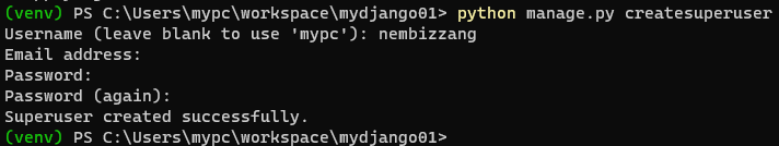 python manage.py createsuperuser # 슈퍼유저 계정 생성(admin 기능을 활용할 수 있는 유저)