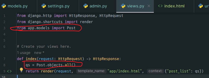 models.py에서 Post라고 정의한 클래스를 import 한 후 Post.objects.all()로 모든 값을 가져오자