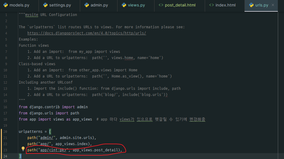 app의 views.py에 app/<id>로 접근했을 시 작동하는 post_detail 함수를 만들어보자.